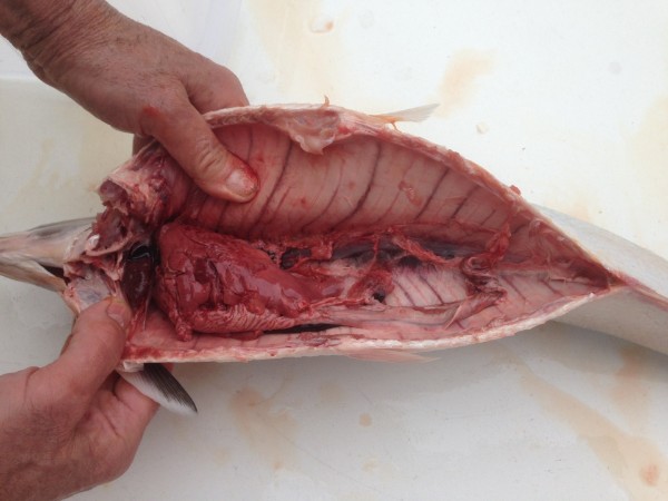 Der Maifisch wird in ca. 2 cm dicke Scheiben geschnitten